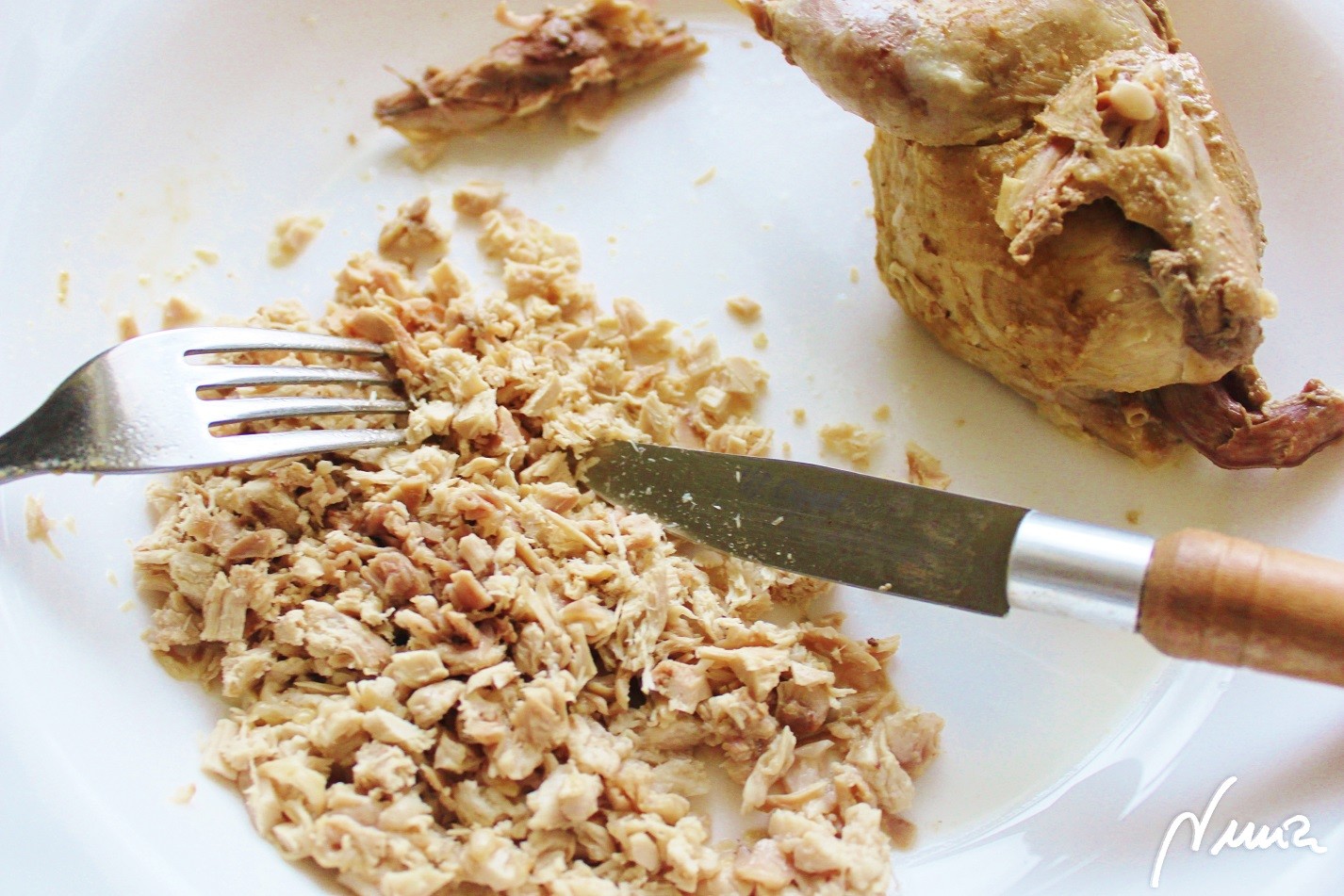 2. Una vez cocidas, sacar y limpiar bien los huesos y piel de las aves, y cortar fino a cuchillo. Reservar el caldo de la cocción.