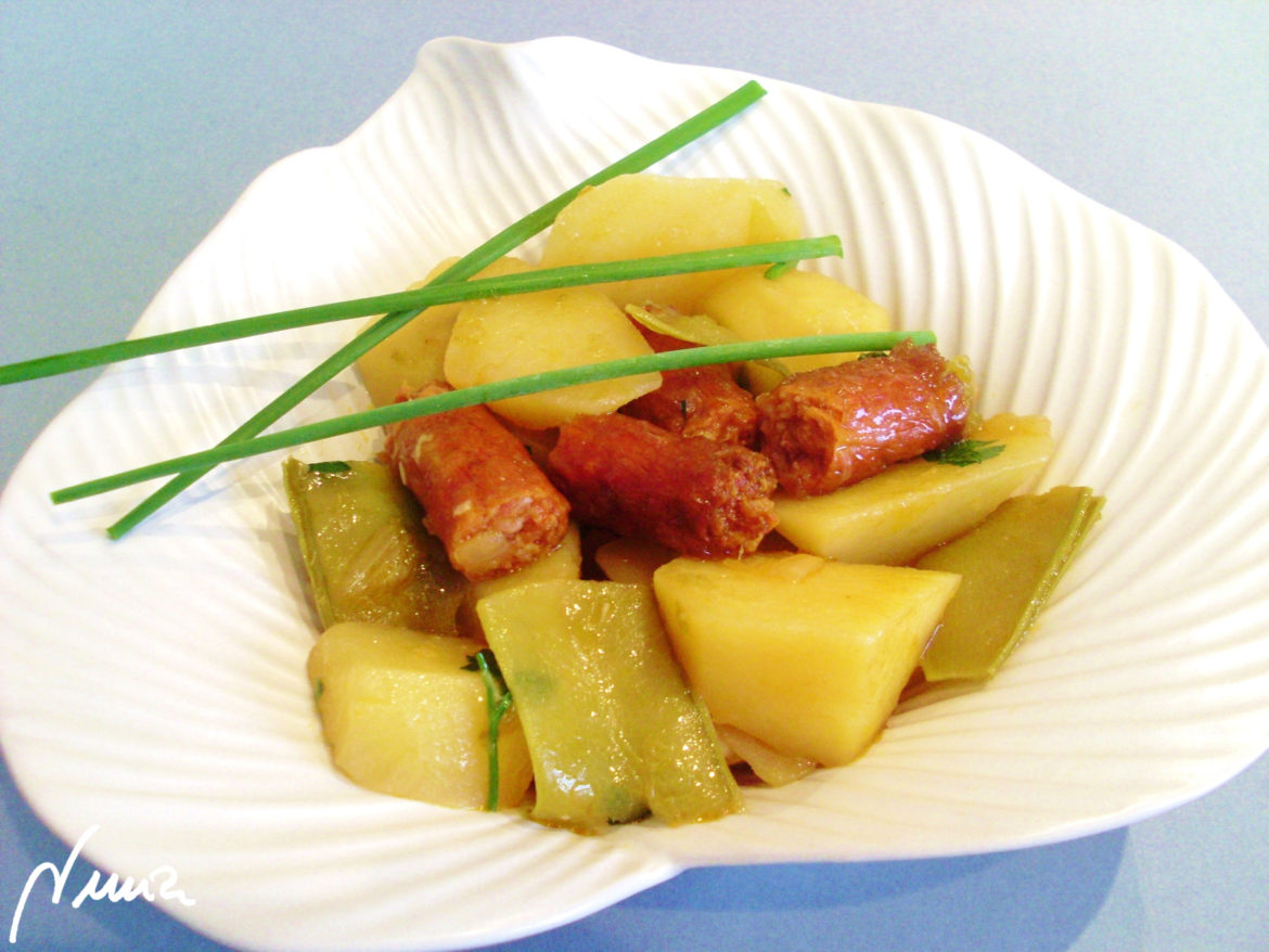 13. En una sartén freír la chistorra en trozos hasta dorarlos bastante y añadir a la cacerola, sin la grasa que soltaron, o también directamente en el plato, sobre el guiso.