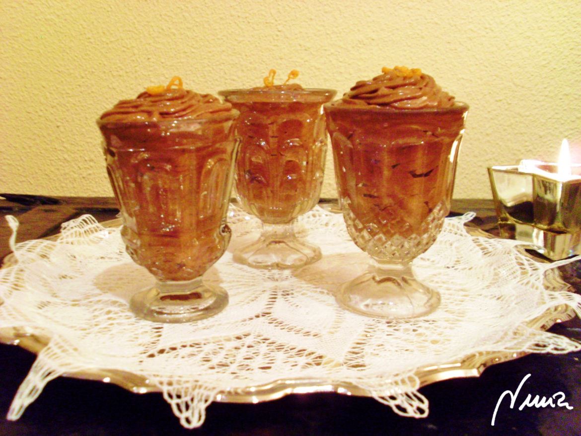 Una mousse (no sé si se escribe así) o espuma (en español queda más correcto) de chocolate muy rica, que mi madre preparaba a menudo y que ya no suele hacer estos postres por aquello de la tensión, el colesterol, los kilos de más, etc..