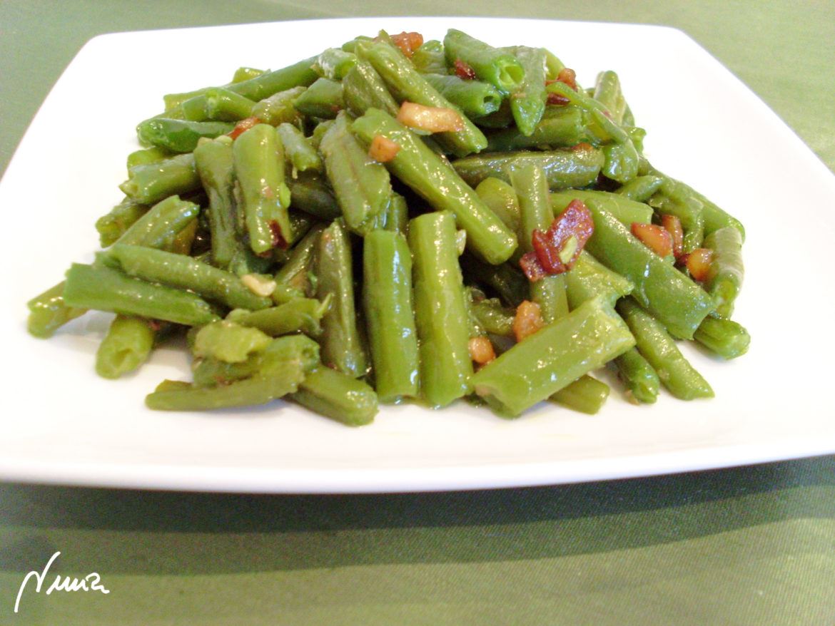 6. Echar un poco de aceite de oliva en una sartén y freír los ajos hasta que empiecen a coger color, en ese momento echar las judías escurridas, echarle sal por encima y freír a fuego medio durante 10-15 minutos, removiendo frecuentemente con cuidado no romperlas.