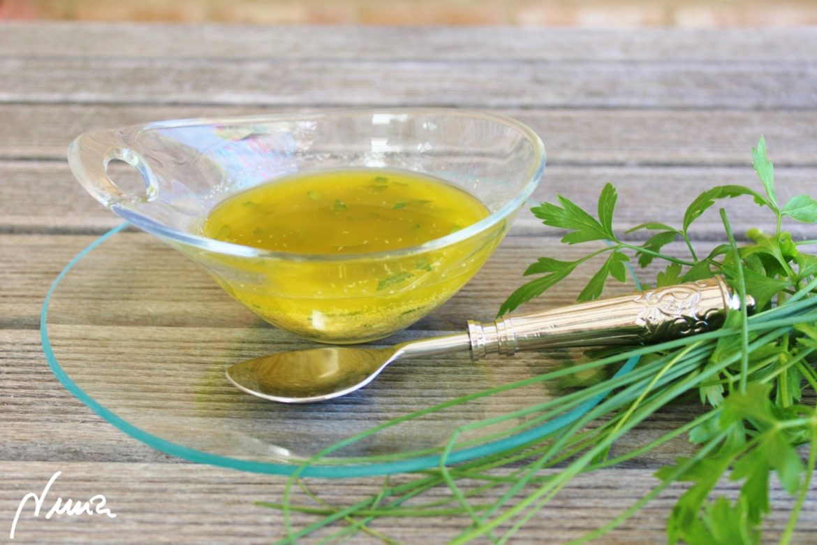 3. En un recipiente echar el aceite, vinagre, sal, pimienta molida, mostaza, perejil y cebollino.