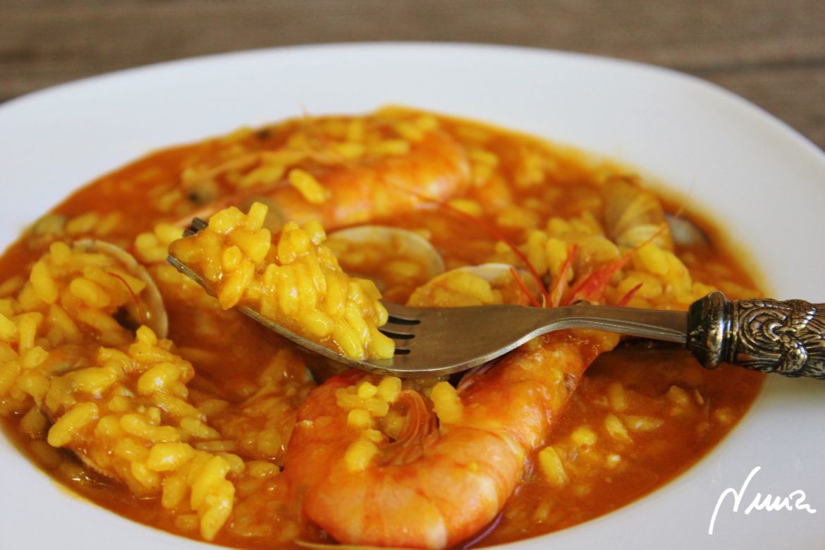 El arroz aún estará ligeramente duro, se terminará de hacer fuera del fuego y estará en su punto en unos 3-4 minutos, así pues hay que servirlo ENSEGUIDA para que no se pase de punto.