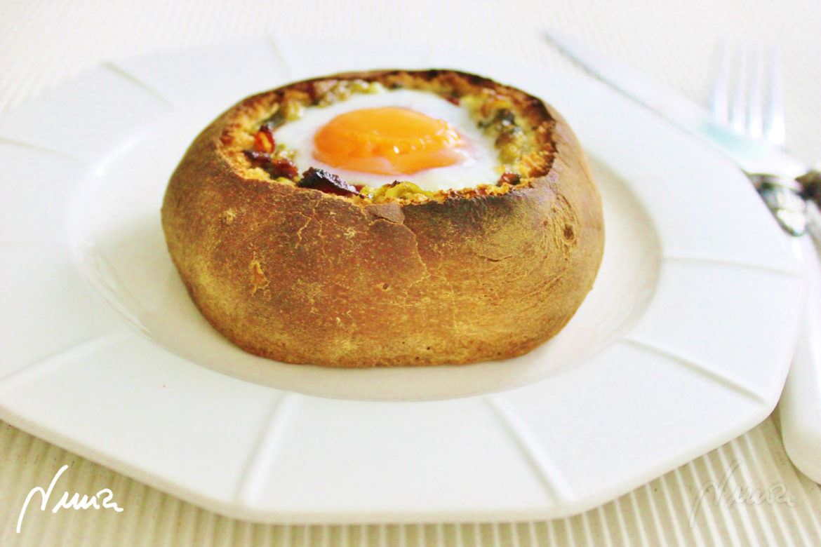Son panecillos rellenos de lechuga frita con bacon y horneado con un huevo encima de la lechuga frita.