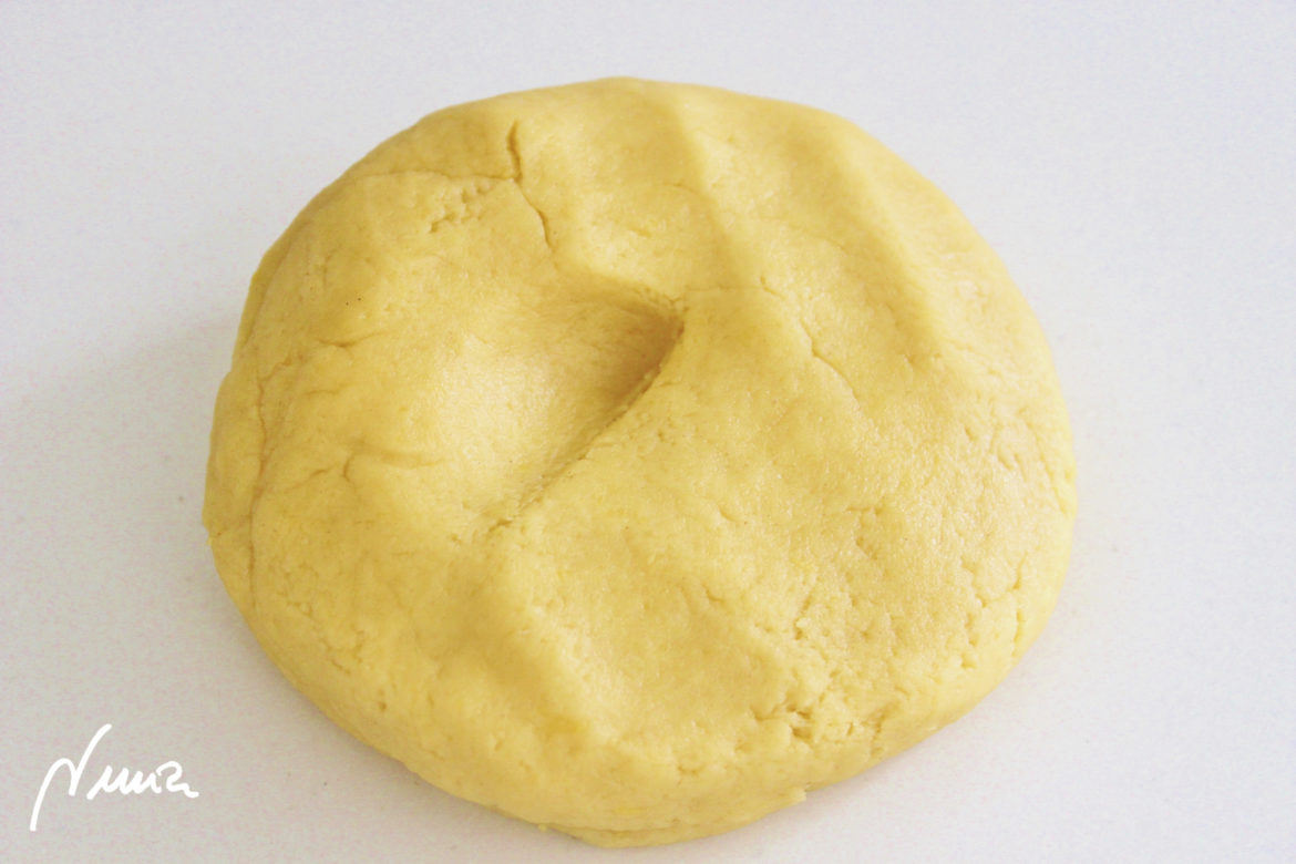 1. Amasar la margarina con la harina y la sal, hasta formar una bola compacta y homogénea.