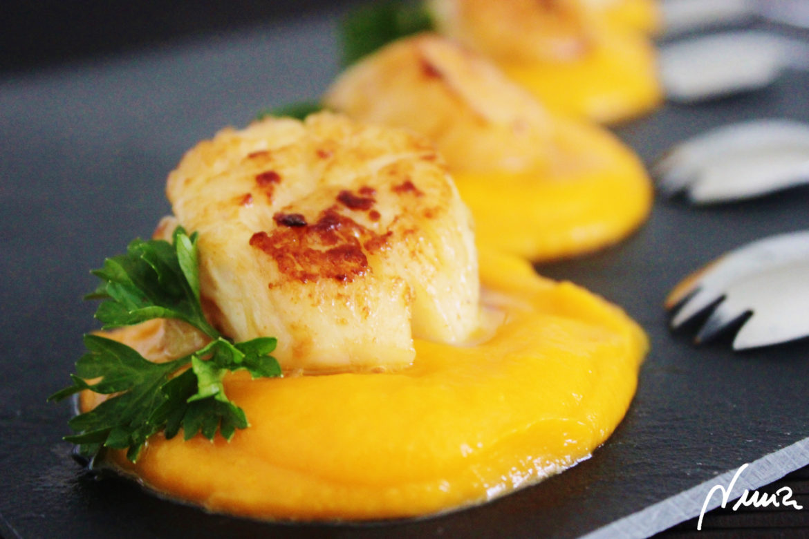 * Vieiras. Pre-calentar el horno a 200 º C 1. Pelar la calabaza y cortarla en trozos. 4. Pinchar y comprobar esté blanda. Presentar la vieira encima de la crema de calabaza.