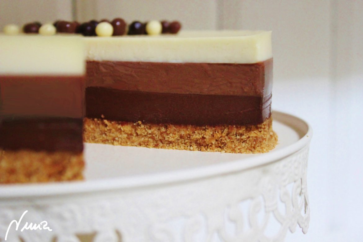 También se pueden colocar las 3 capas en orden inverso: primero la capa de chocolate blanco, luego la de chocolate con leche y arriba la de chocolate negro.